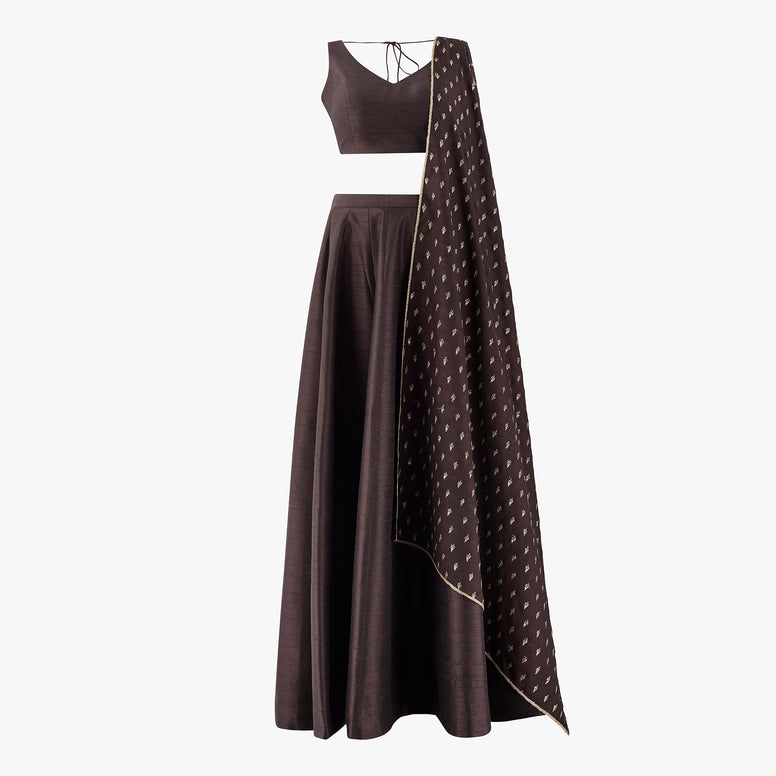 Ella made-to-measure lehenga set is giving a modern take on Indian wear with modern versatility. The set features a plain semi raw silk top and lehenga with the lehenga thoughtfully crafted to be styled repeatedly with a variety of blouses—Indian or western, making it a wardrobe essential. We have paired this lehenga a sequin and zari dupatta finished with a gold trim. This look is perfect for wedding receptions, cocktail parties and evening celebrations.