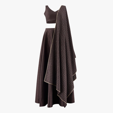 Evora made-to-measure lehenga set is giving a modern take on Indian wear with modern versatility. The set features a plain semi raw silk top and lehenga with the lehenga thoughtfully crafted to be styled repeatedly with a variety of blouses—Indian or western, making it a wardrobe essential. We have paired this lehenga a chikan kari dupatta finished with a gold trim. This look is perfect for wedding receptions, cocktail parties and evening celebrations.