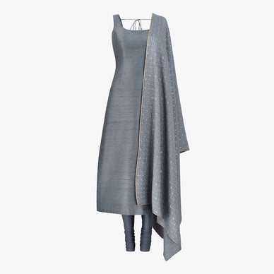 Lily made-to-measure kameez set has been designed for timeless elegance and modern versatility. The set features a plain semi raw silk kameez and pajami with chikan kari and paper mirror dupatta finished with a gold trim.