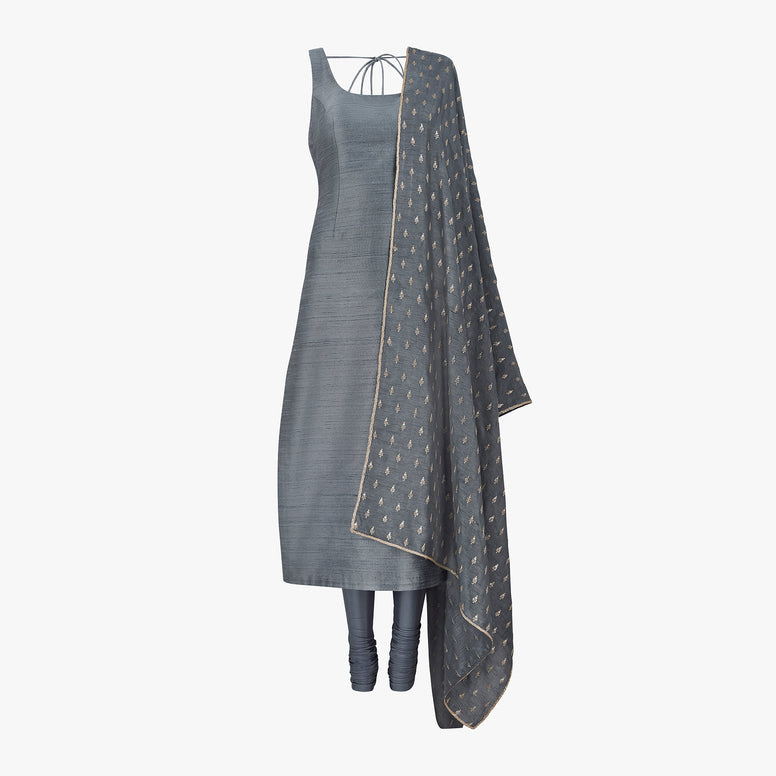 Liore made-to-measure kameez set has been designed for timeless elegance and modern versatility. The set features a plain semi raw silk kameez and pajami with sequin and zari embroidered silk dupatta finished with a gold trim.