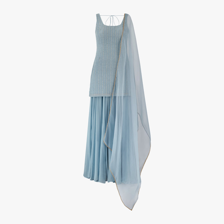 Nathalie chikan kari kameez and sharara set is a made-to-measure ensemble crafted for timeless elegance. The kameez features intricate chikan kari embroidery accented with delicate sequin detailing for a soft, luminous finish. It is paired with a flowing georgette sharara and a pure organza dupatta, finished with an elegant gold trim.