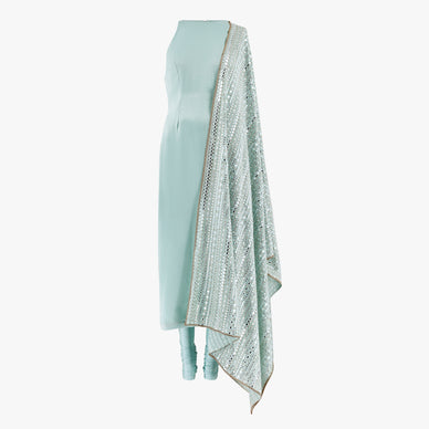This suede and georgette mix made-to-measure kameez set, Serena, introduces a new fabric to the collection, offering a soft, delicate drape with a refined matte texture. Designed to complement intricate detailing, it is paired with a chikan kari and mirror dupatta for understated elegance. Finished with a comfortable lycra pajami, this designer Indian ensemble allows you to showcase your heels with ease.